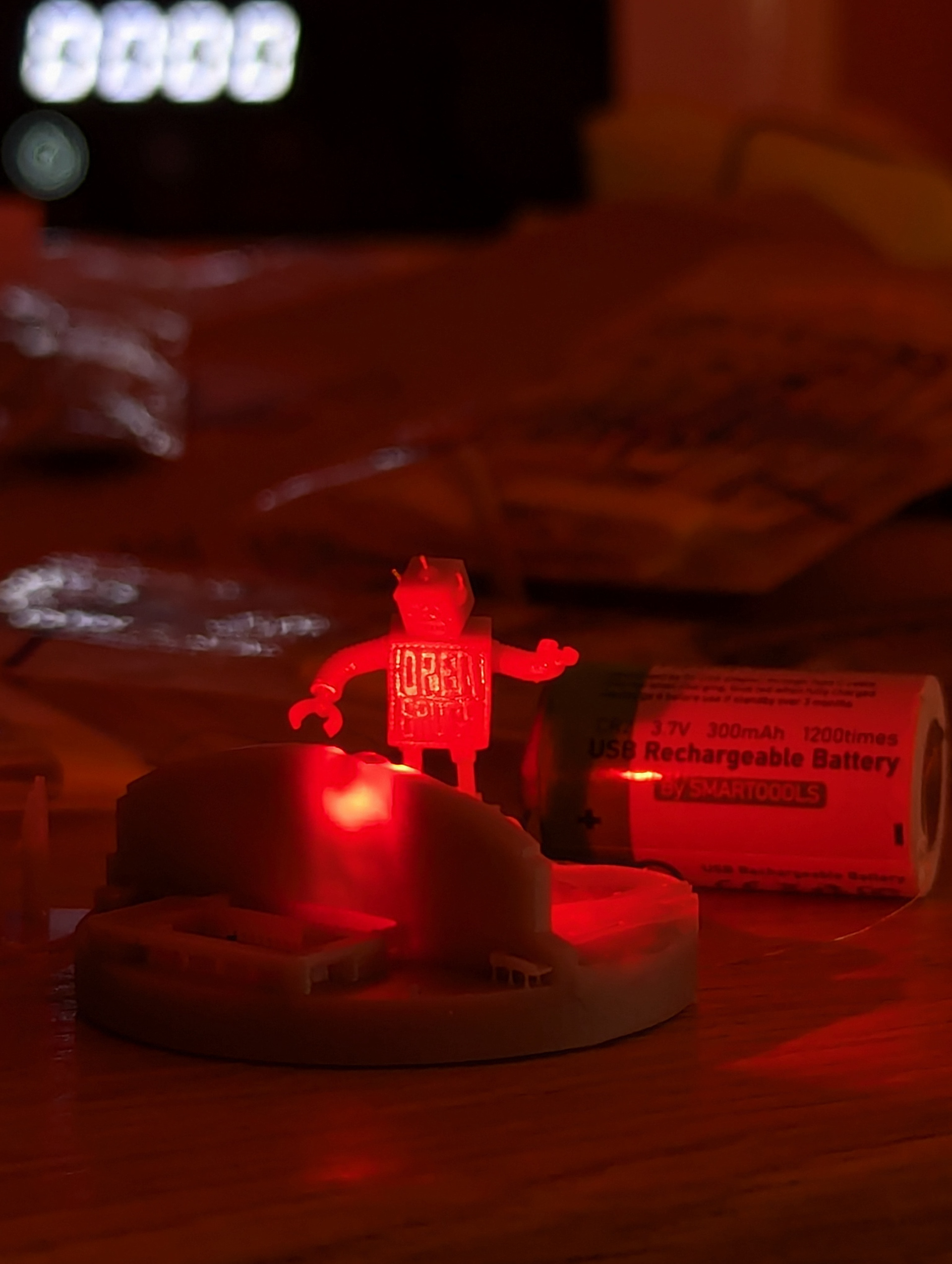 The laser-eyes were such an essential part of the original piece that I had to include them in the snowglobes. To that end, I tried a few different options before landing on small pieces of fiber-optic plastic lit on the end by two 0603 SMD LEDs. That was powered by a USBC rechargable battery and sips power, so ideally won't need to be charged for a LONG time.