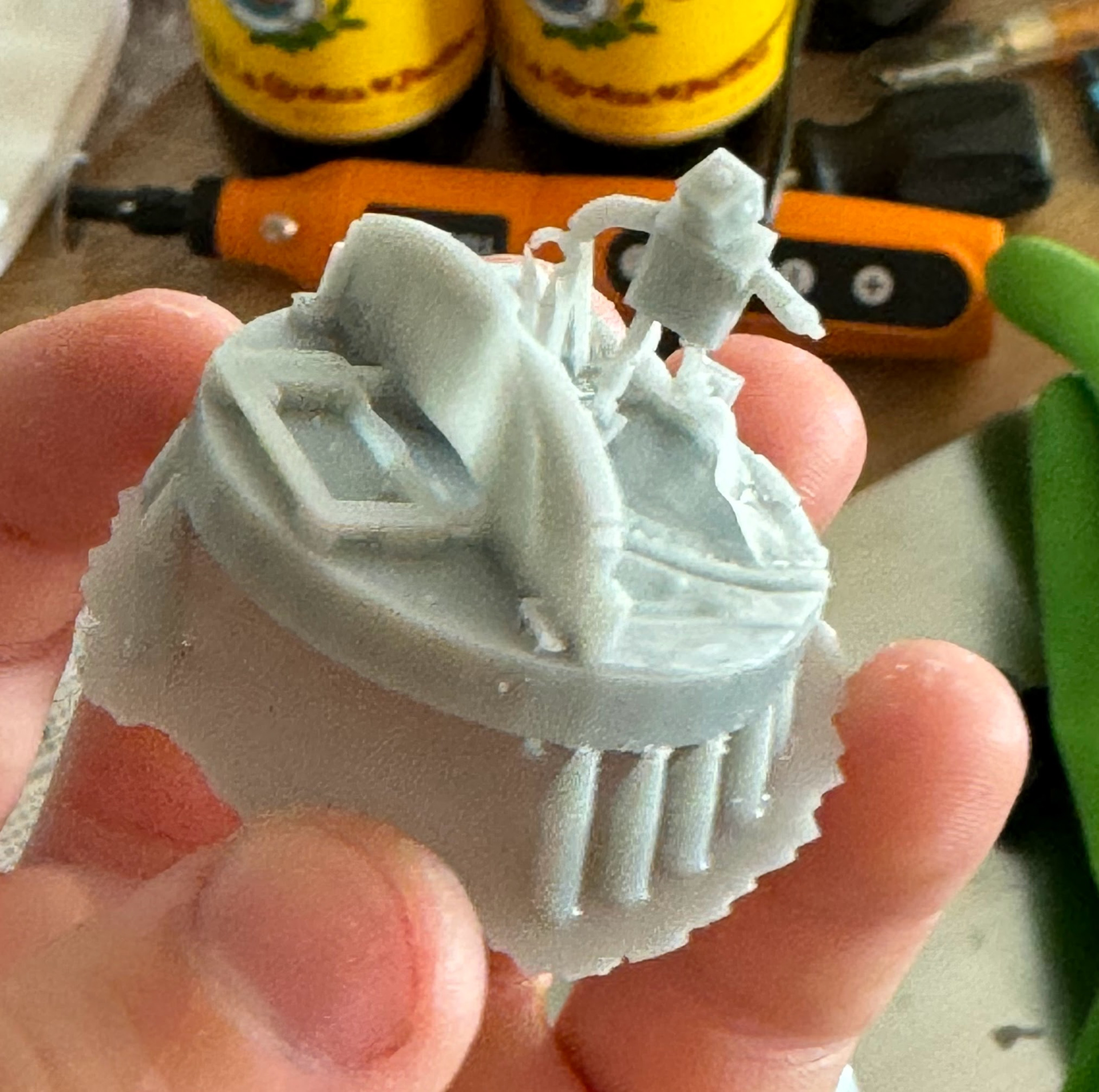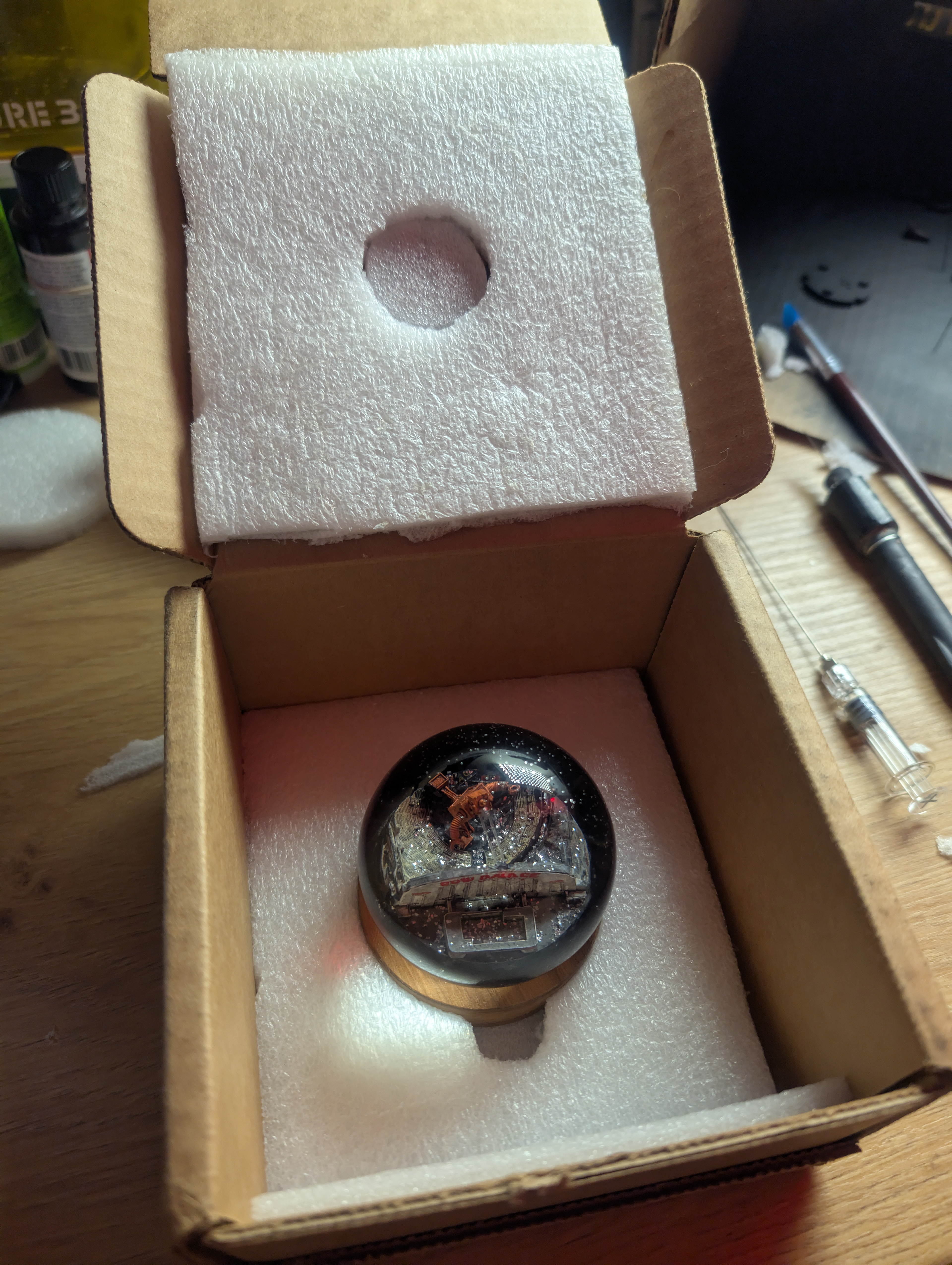 The scene is resin-printed, fused to an FDM printed base, painted and then waterproofed. The domes themselves are just some glass ones off Amazon, and are sealed into the base with E6000 and some Flex-Seal.