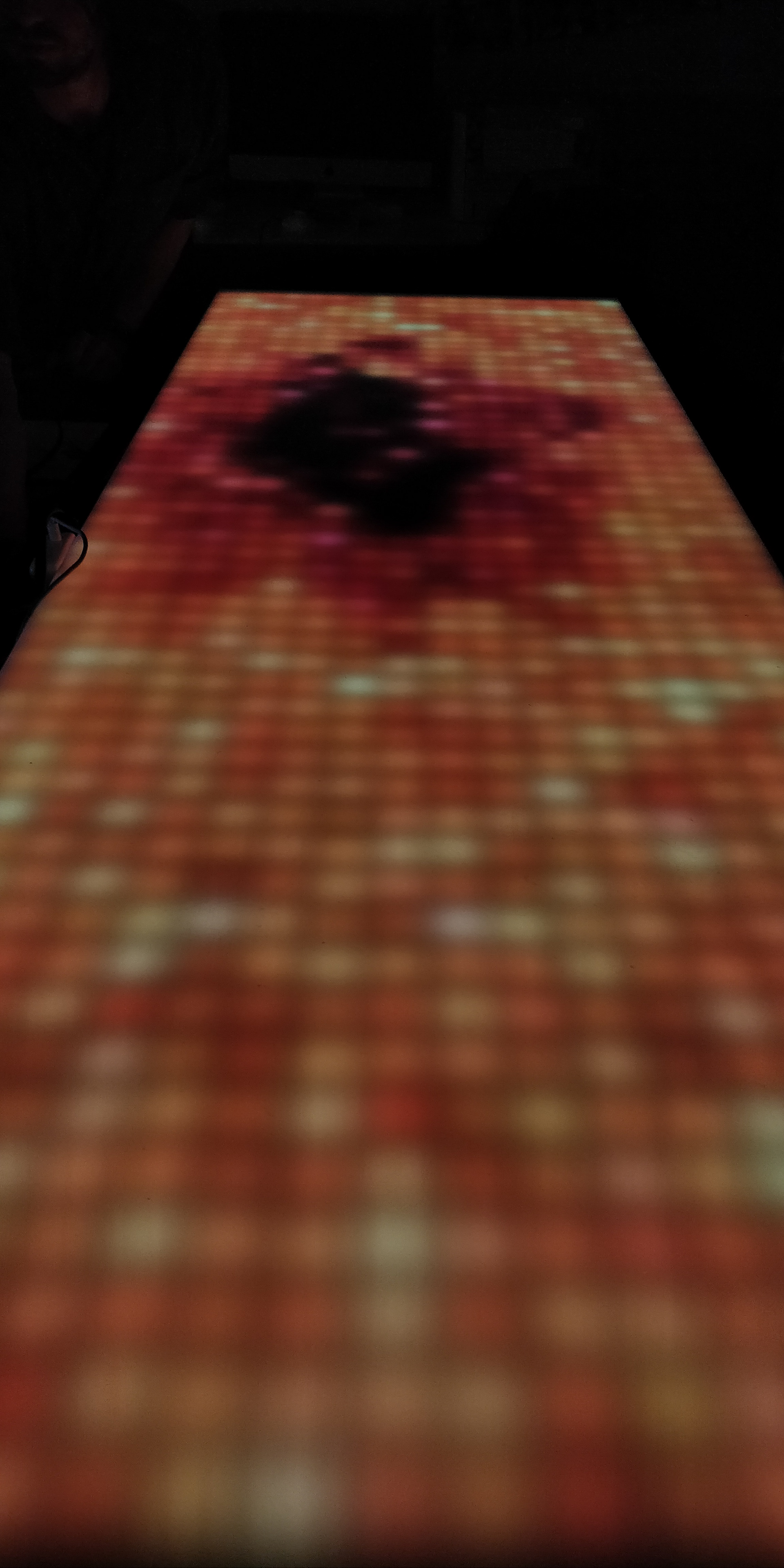 The summer consisted of a couple weeks of prototyping, testing LED grids with different diffusion layers before settling on 1" thick HDPE to protect and support patrons walking on it. After that, we began planning and constructing five 2ft x 6ft panels that could be connected together to form a large LED screen. The panels use laser-cut MDF to evenly space addressable LED strips. A processing sketch written by another teammate is run on a Raspberry pi and displayed on the panels. Multiple Adafruit Fadecandy's instruct the LED strips how to function.
